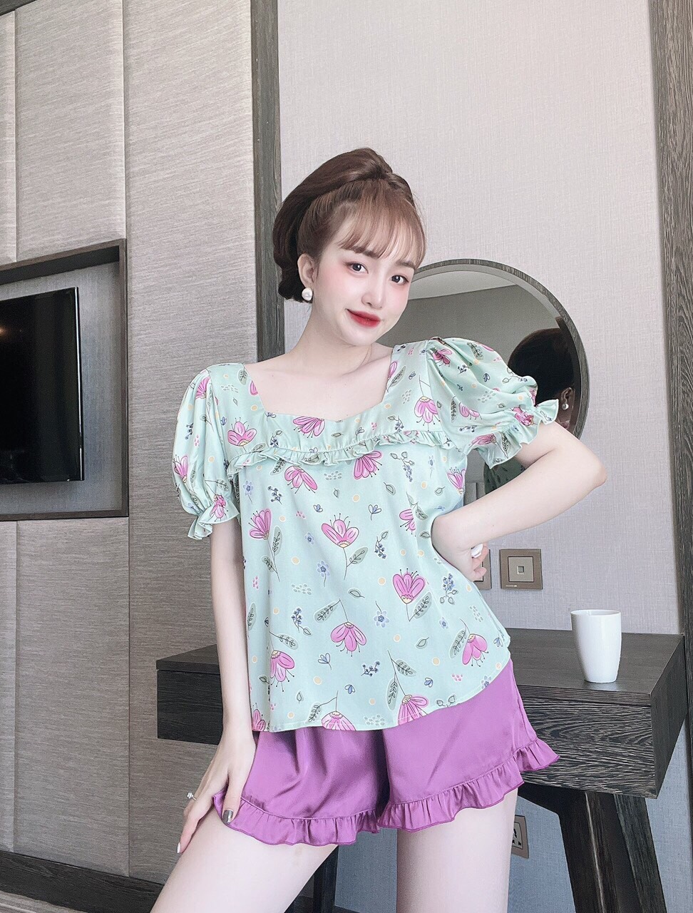 Đồ bộ mặc nhà nữ, đồ ngủ nữ tay ngắn quần đùi vải lụa thoáng mát hoạ tiết xinh xắn