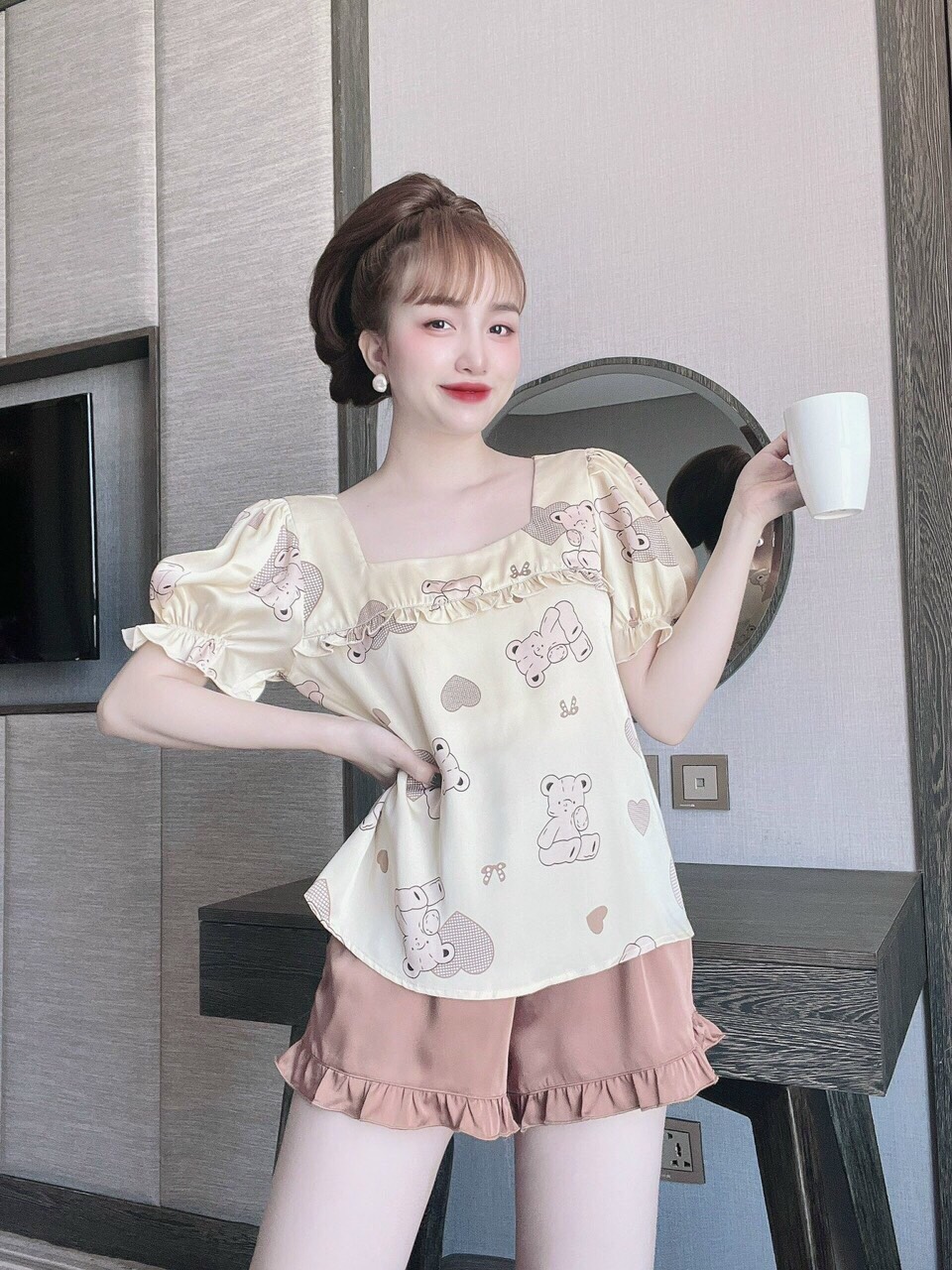 Đồ bộ mặc nhà nữ, đồ ngủ nữ tay ngắn quần đùi vải lụa thoáng mát hoạ tiết xinh xắn